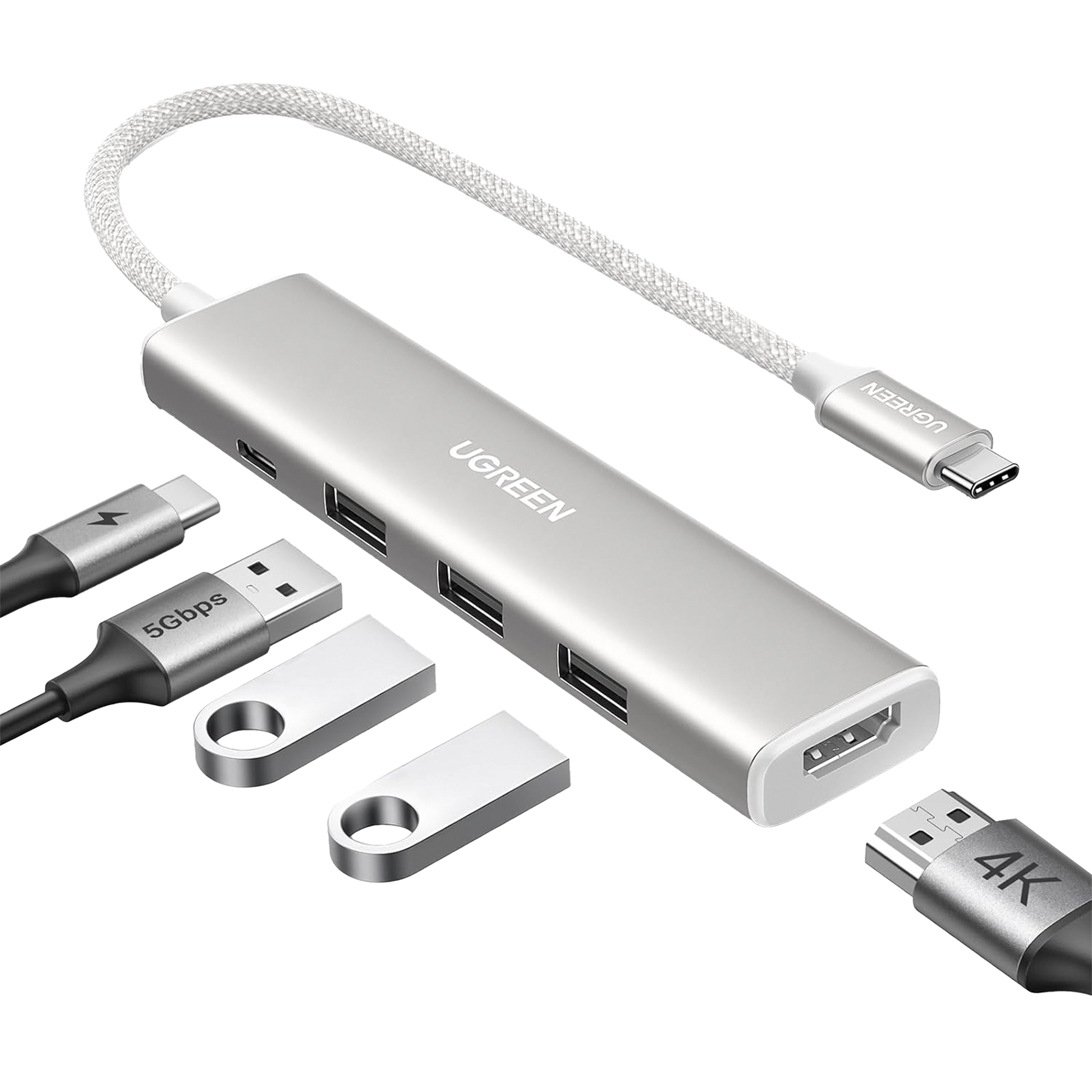 HUB USB-C (Docking Revodok) 5 en 1 | HDMI 2.0 4K@30Hz | 3 USB-A 3.0 (5Gbps) | USB-C PD Carga 100W | Chip de Última Generación | Cable de Nylon Trenzado de 25 cm | Carcasa de Aluminio | Color Blanco.