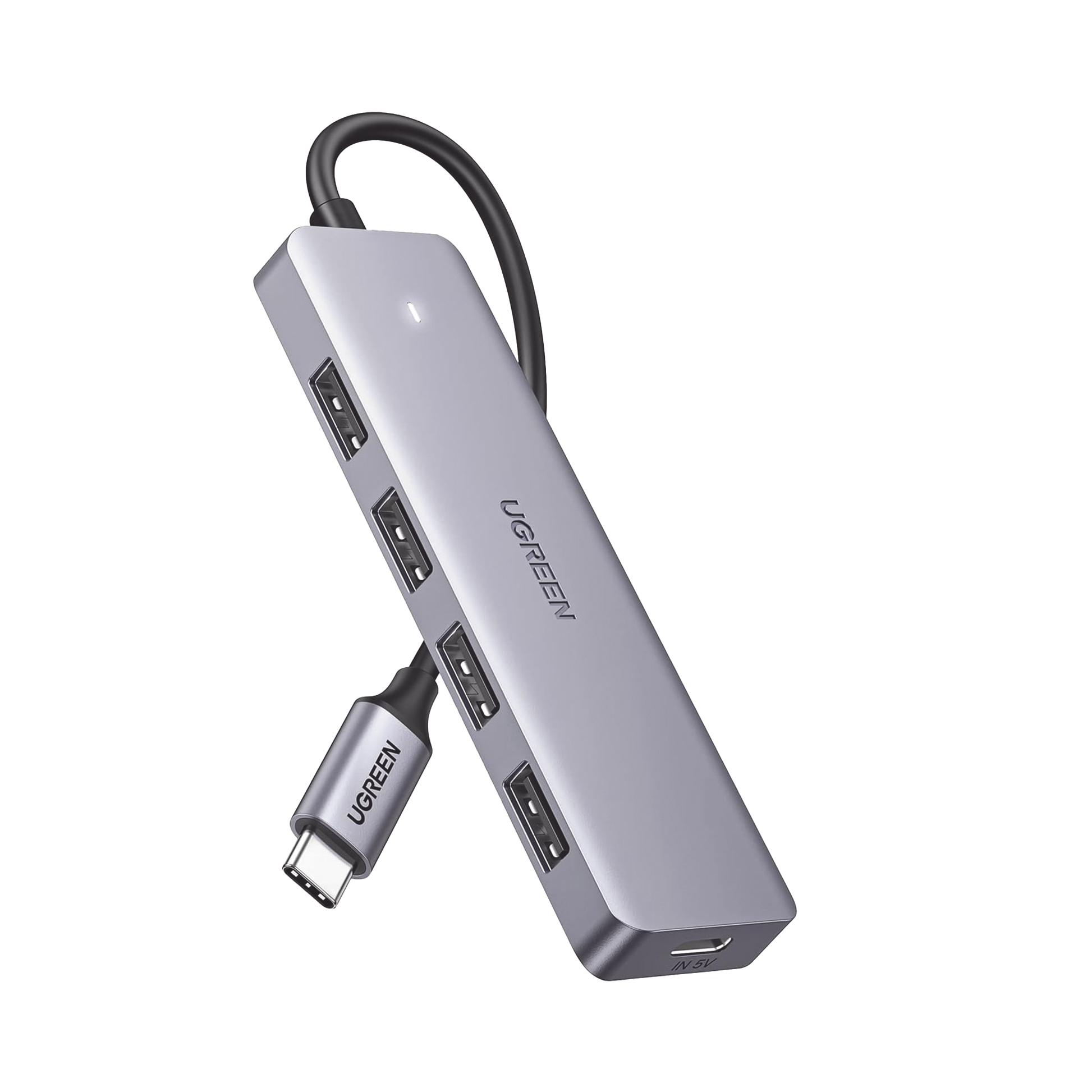HUB USB-C 3.0 4 EN 1 | 4 Puertos USB-A (5Gbps) | Carcasa ABS + PC | Soporta OTG | Luz Indicadora LED | Compatible con iPhone 15 Pro MAX) | Interfaz Niquelada | Color Gris Metalizado | Cable de 15cm.