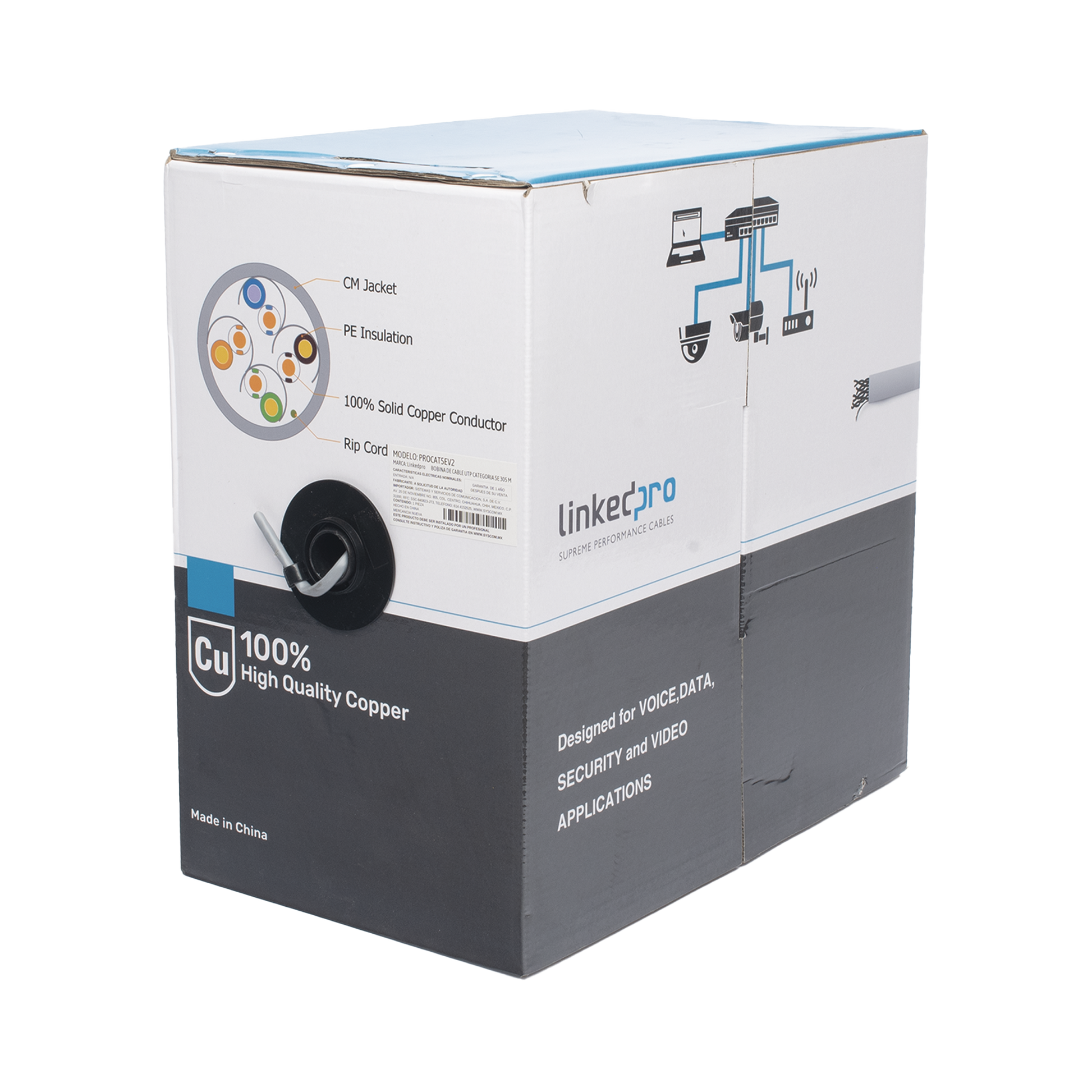 Bobina de cable de 305 m, ( 1000 ft ), Cat5e, alto desempeño, de color Gris, UL, para aplicaciones en video vigilancia, redes de datos. Uso Interior